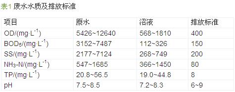 豬場(chǎng)廢水具有有機(jī)物、懸浮物濃度高,富含氮磷且沖擊負(fù)荷大等特點(diǎn),一般先采用厭氧進(jìn)行處理,降解廢水中大部分有機(jī)物,但其出水(沼液)中的有機(jī)物、氮磷濃度仍然很高,需進(jìn)一步處理,且碳氮比較低,處理難度大〔1, 2, 3, 4, 5〕。有必要探索一套技術(shù)及經(jīng)濟(jì)均可行的新型豬場(chǎng)沼液處理工藝并進(jìn)行工程示范,為豬場(chǎng)沼液治理奠定基礎(chǔ)。1 工程概況江西省某規(guī)?;B(yǎng)豬場(chǎng)的廢水排放量為150 m3/d,之前已建有厭氧設(shè)施:升流式固體厭氧反應(yīng)器(USR)及沼氣池,為進(jìn)一步保護(hù)周邊環(huán)境,啟動(dòng)廢水深度處理工程,使出水滿足《畜禽養(yǎng)殖業(yè)污染物排放標(biāo)準(zhǔn)》(GB 18596—2001)。1.1 廢水的水質(zhì)水量該養(yǎng)豬場(chǎng)主要來(lái)源于沖欄水、豬糞尿等,具體水質(zhì)水量及相應(yīng)排放標(biāo)準(zhǔn)見表 1。